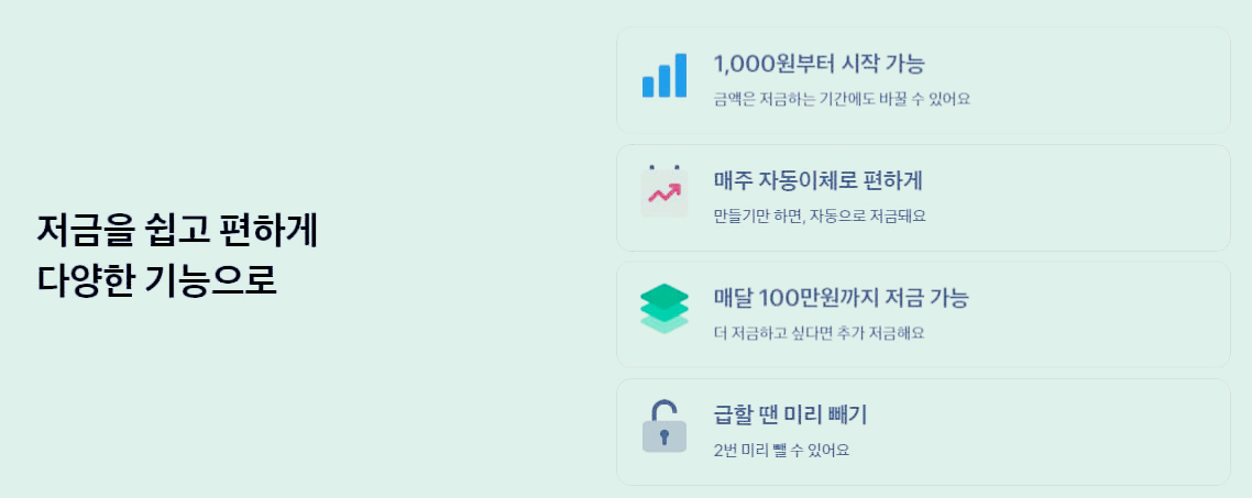 1천 원부터 시작이 가능하며 매달 100만 원까지 저금이 가능합니다. 자동이체로 편하게 미션달성을 할 수 있는 게 장점입니다.
